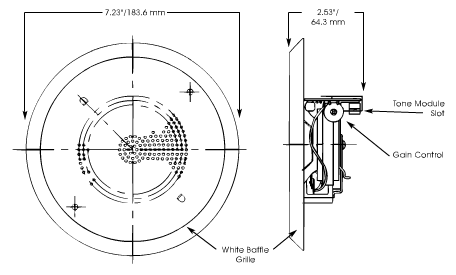 The 50GCB is designed for areas without high ambient noise levels, such as offices, hallways and receptions areas. The baffle allows the four-inch speaker to be installed easily in any suspended ceiling plenum with a Model R4NB backbox. The white grill of the 50GCB is attractive in most decors.