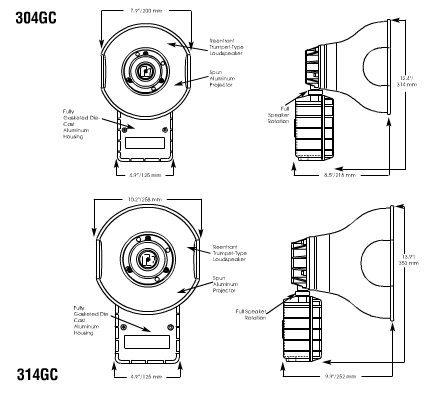The speaker cone and projector are constructed of rugged spun aluminum. The solid-state amplifier circuit is protected in a diecast aluminum housing. Dust- and moisture-proof gaskets provide protection from the elements. All external surfaces are sealed with gray powder coat paint. The 304GC is easily installed on any flat surface.