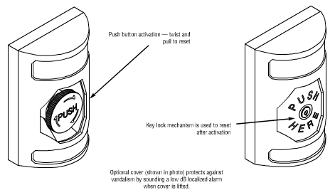 Each unit is available with or without a tamper-resistant polycarbonate cover. Covered units work to protect against physical damage to the station and to prevent false alarms without restricting use in emergency situations. When the cover is lifted to gain access to the alarm, a piercing tone sounds, calling immediate attention to the area. The piezo horn is quiet once the cover is closed. Power to the piezo alarm is provided by a 9VDC battery (included). The sounder cover mounts easily over the station with four anchor screws.