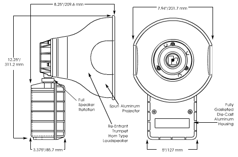 The Federal Signal Model AM15 is a rugged, re-entrant speaker for use in public address or paging applications. This 15 watt speaker features a rugged speaker cone and projector constructed of spun aluminum. The speaker wiring connections are enclosed in a dust- and moisture-proof, die-cast aluminum compartment. All external surfaces are sealed with gray powder coat paint.