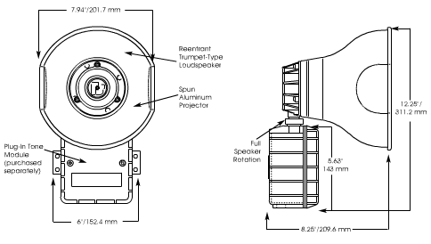 Four screws inserted through the metal tabs located at the sides of the housing provide a quick wall mount installation. Two 1/2-inch conduit openings in the base of the housing simplify wiring and accommodate inbound and outbound audio wiring. The unique shape of the speaker projector provides a 60º sound dispersion. The projector is held in position with a Teflon coated lock ring that can be rotated 180º in order to obtain the desired sound distribution.