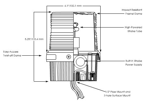 The Fireball features a unique dome that twists off easily for quick dome and lamp replacements. The newly redesigned base features an integrated 1/2-inch pipe mount base as well as the three holes required for surface mount configurations. Black epoxy paint is electrostatically applied to the base for superior corrosion resistance. The Fireball dome and base design provides a watertight, dust-tight and corrosion resistant Type 4X rating.