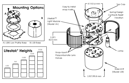 Litestak units can be installed on a 3/4" pipe mount or surface mounted with the Model LSB Base. If low profile surface mounting is required, Model LSBS is available.